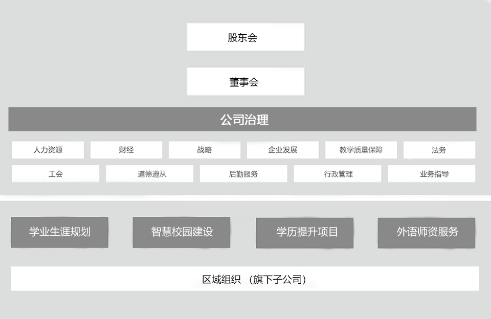 集团总公司管理集团职能平台:人事,财经,战略,企业发展,教学质量保障,法务工作,工会活动,后勤服务,行政管理以及道德价值观考核业务指导均由集团总公司统一领导